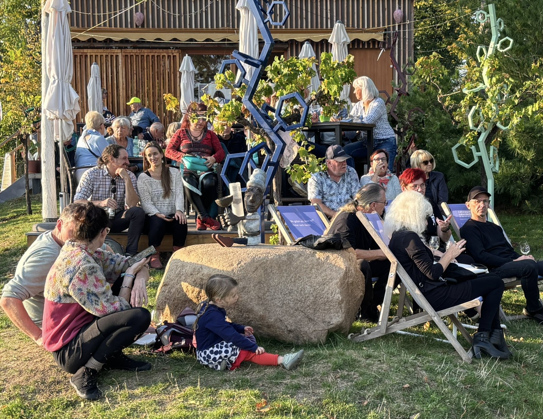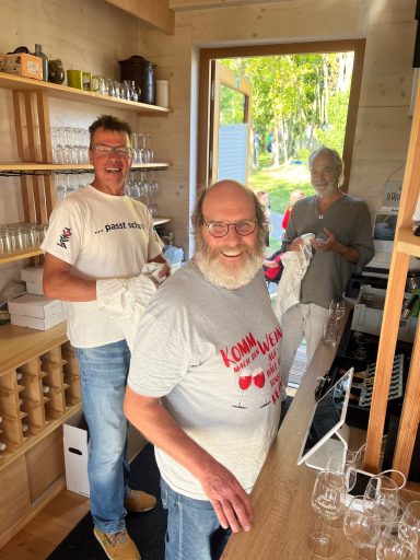 Im Zuge der Landesgartenschau wurde der Weinberg am Südhang zur Saale neu geschaffen, da durfte eine Weinlaube nicht fehlen! Hier haben viele Vereinsfreunde über die gesamten 178 Tage ehrenamtlich mit viel Herzblut bei Wind und Wetter die Gäste mit besten Weinen, kleinen Snacks, regelmäßigen Weinlaubengesprächen und sonntäglicher Livemusik verwöhnt. Und weil uns das so viel Spaß und Freude bereitet hat, machen wir mindestens genauso enthusiastisch weiter - selbstverständlich wieder ehrenamtlich in unserer Freizeit! Der „Dienst“ in der Weinlaube ist für uns der perfekte Ausgleich zu unseren Jobs und eine kleine Flucht aus dem Alltag. ( „Hier bekommen wir zwar kein Geld, haben aber jede Menge Spaß mit netten Leuten.“ : )